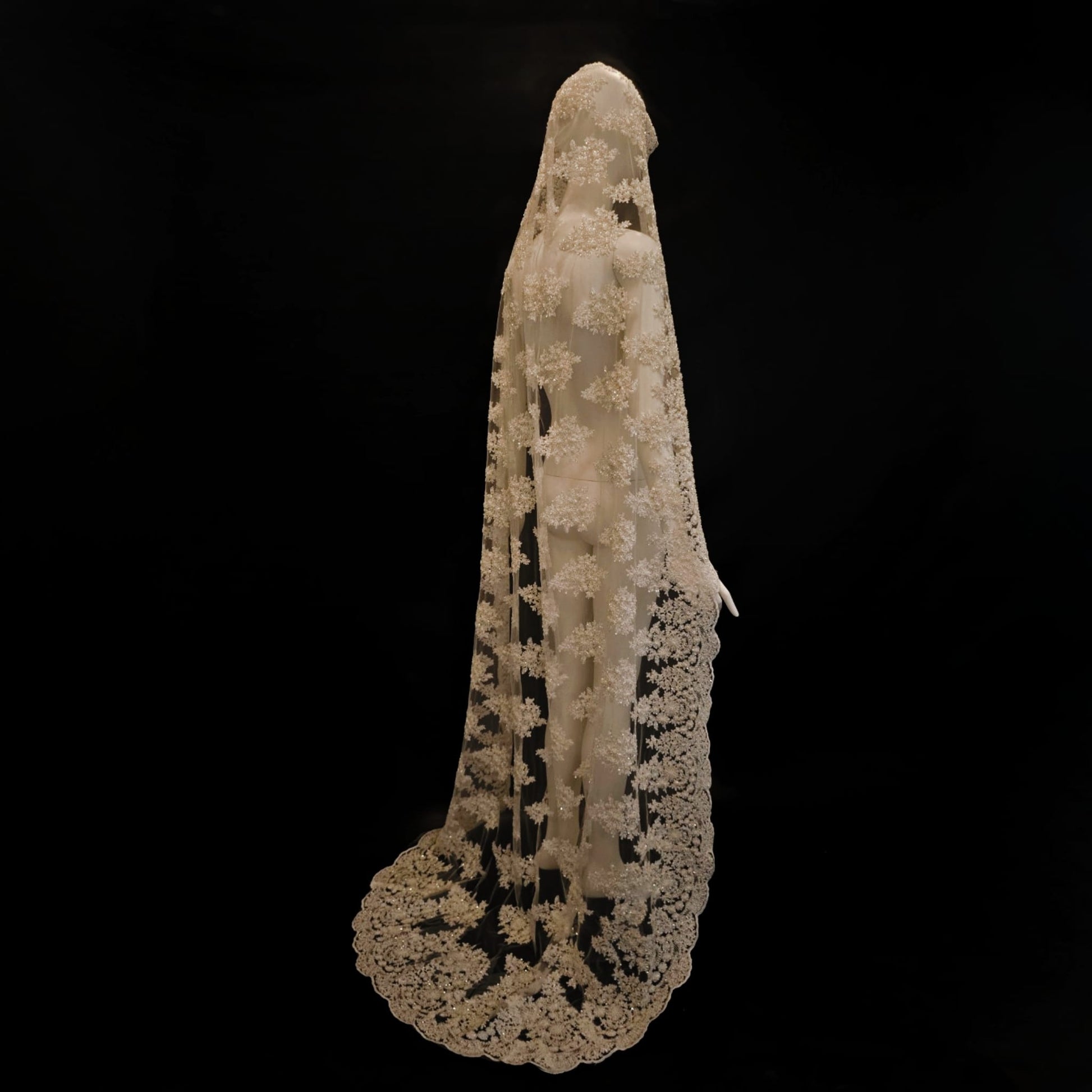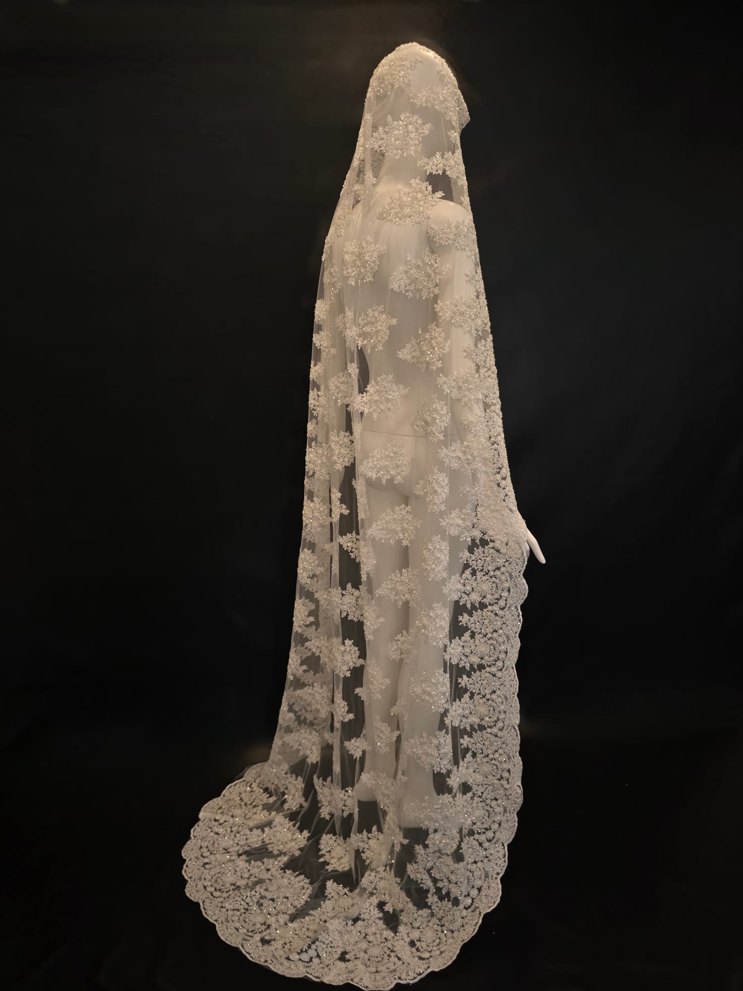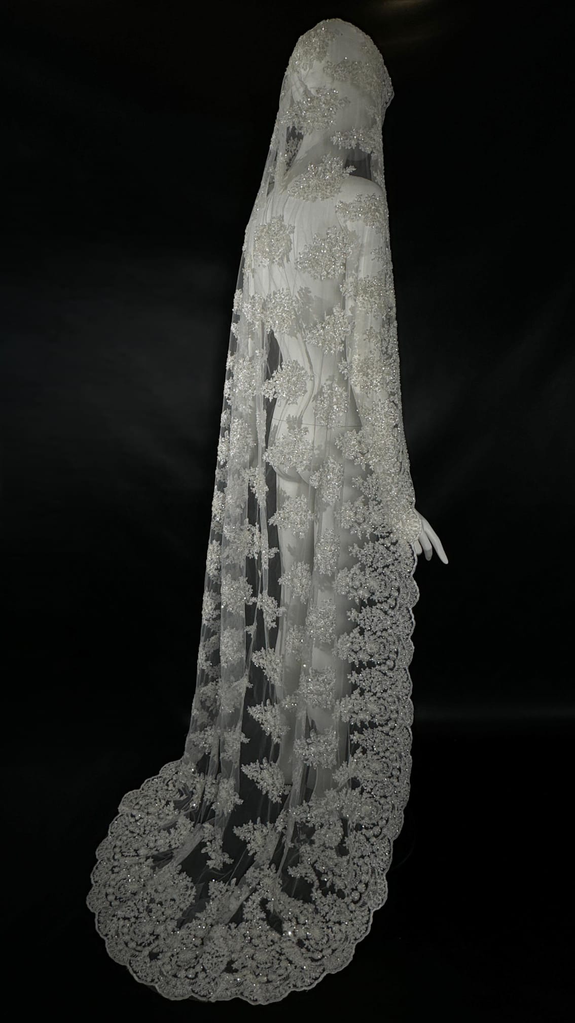 Cream off white lace fully embroidered with satin thread, glass beads, pearls and clear sequin. 8 feet in length. Length is customizable.